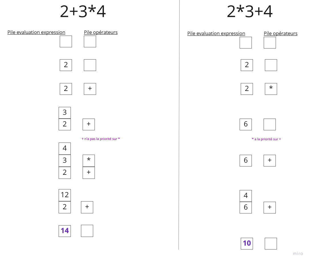 Par exemple pour l’expression : 1+(2+(3+4)) les états successifs de pileExpression sont1 1 2 1 2 3 1 2 3 4 1 2 7 1 9 10et ceux de ops sont